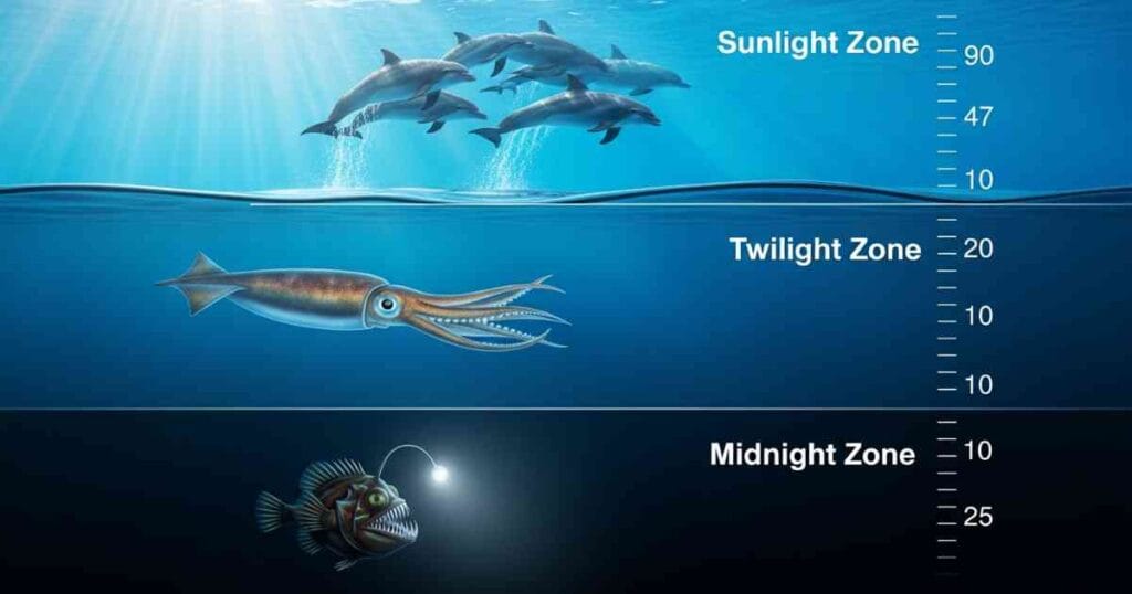 3. The Midnight Zone (Bottom): It is pitch black. No sunlight reaches here ever. The pressure is so strong it would crush a car. The animals here are strange—some even glow in the dark to see!